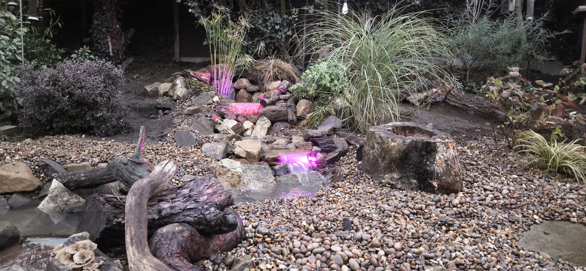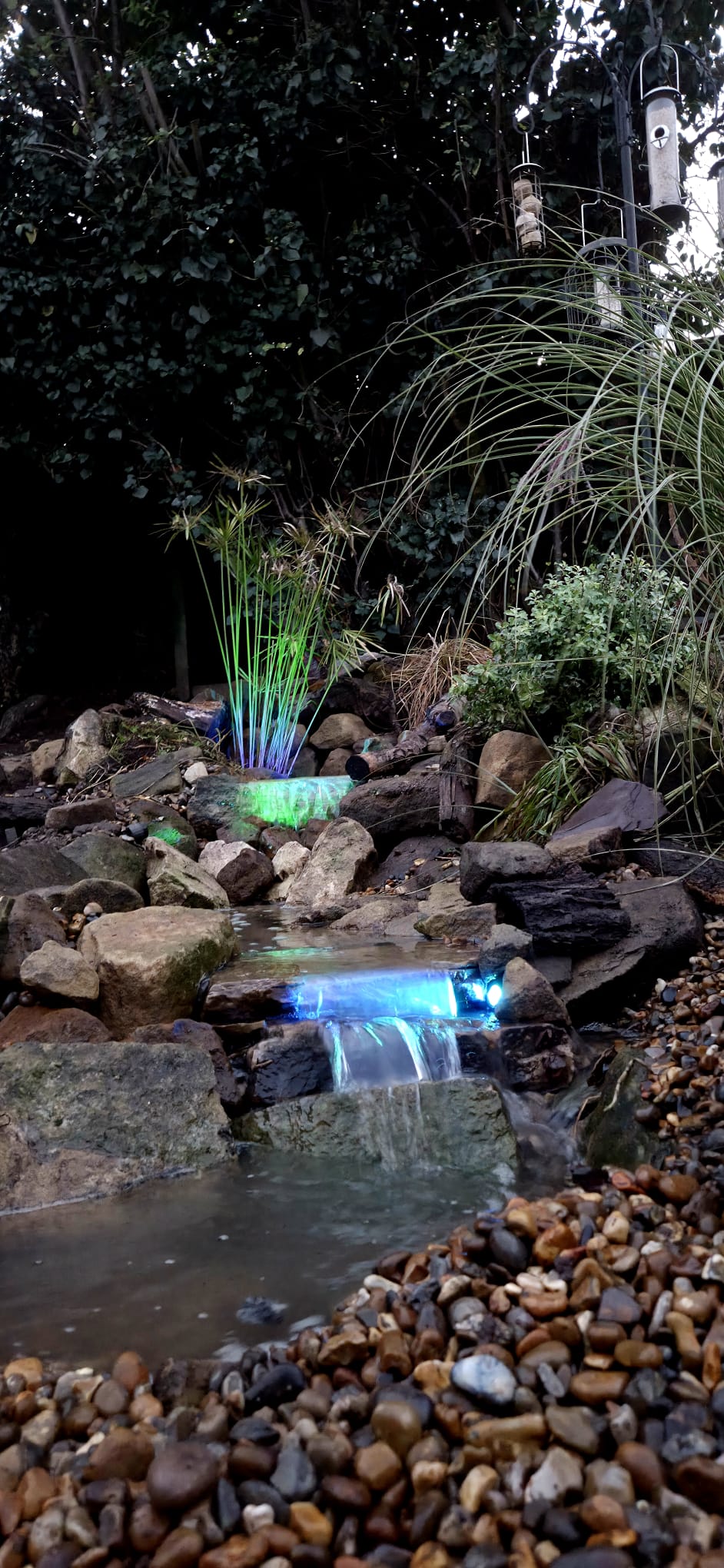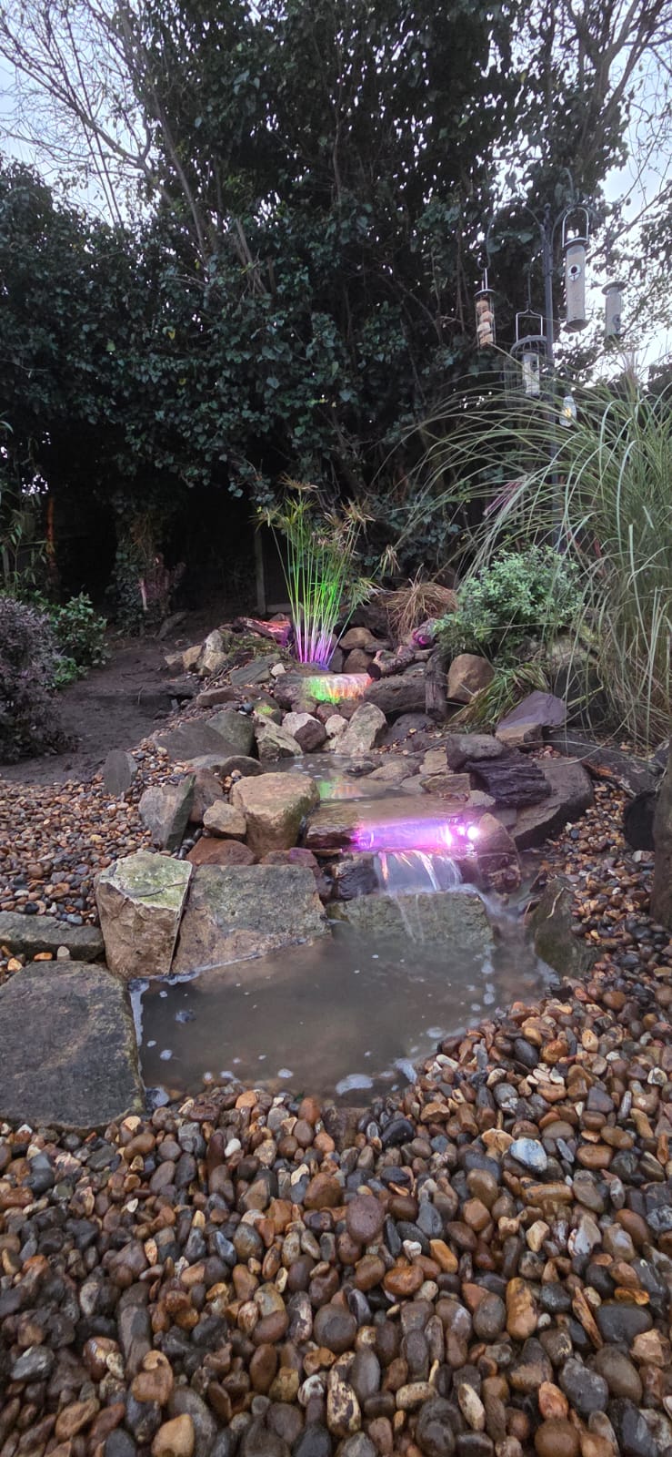 We replaced the original waterfall with a new multi-drop design, each drop adding movement, sound, and oxygenation. Colour-changing lights were added at the customer’s request within the falls, giving the customer control over the atmosphere day or night.