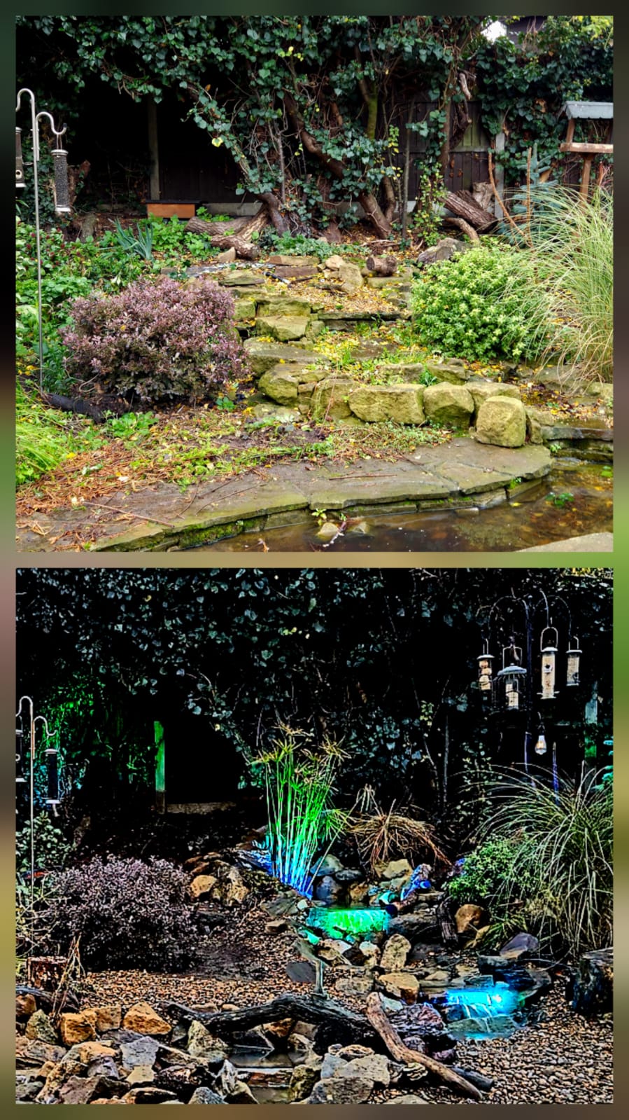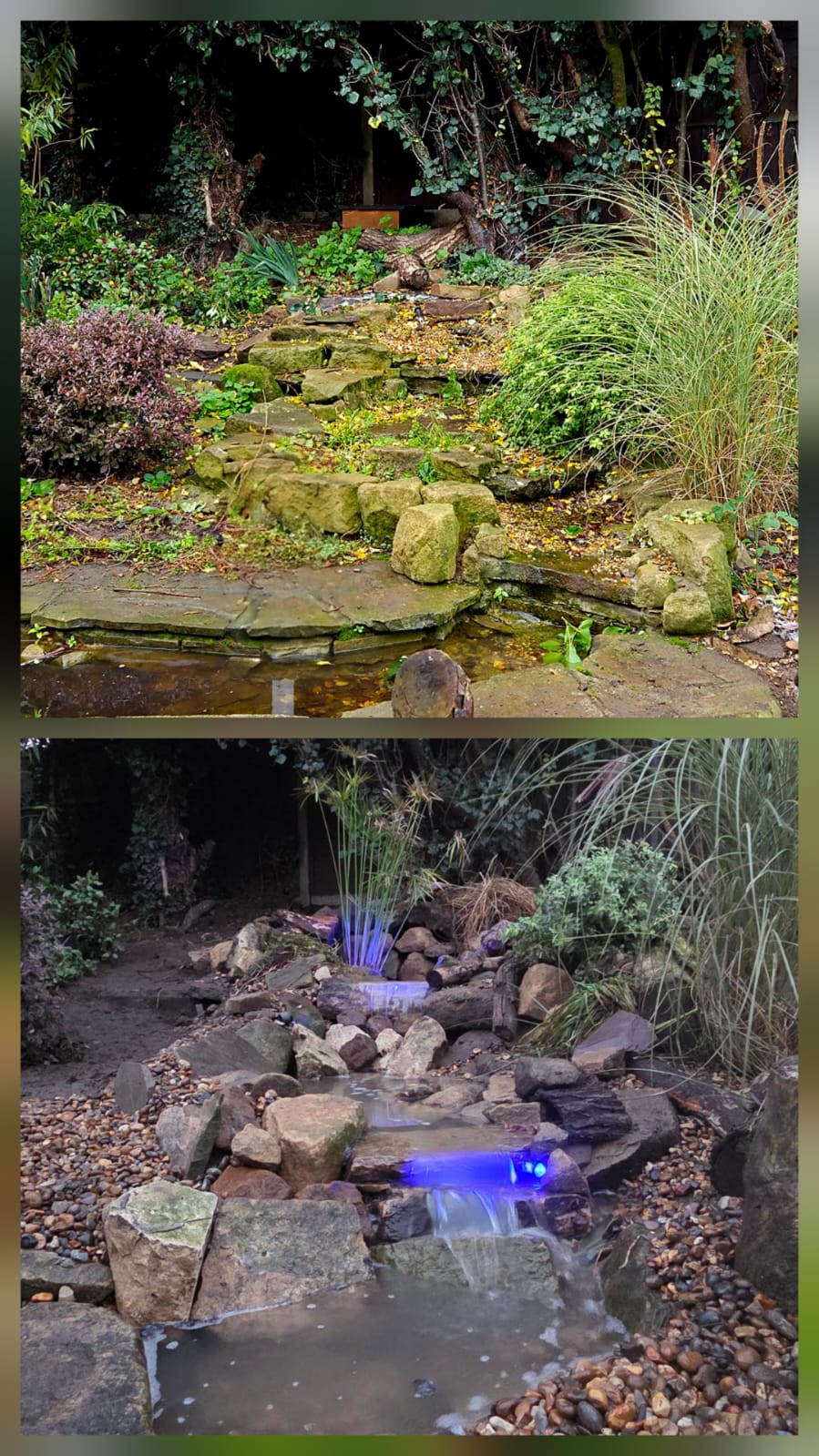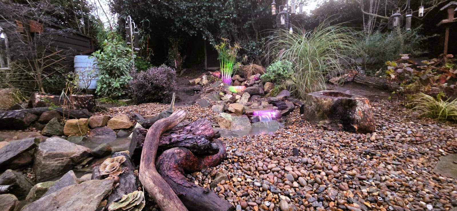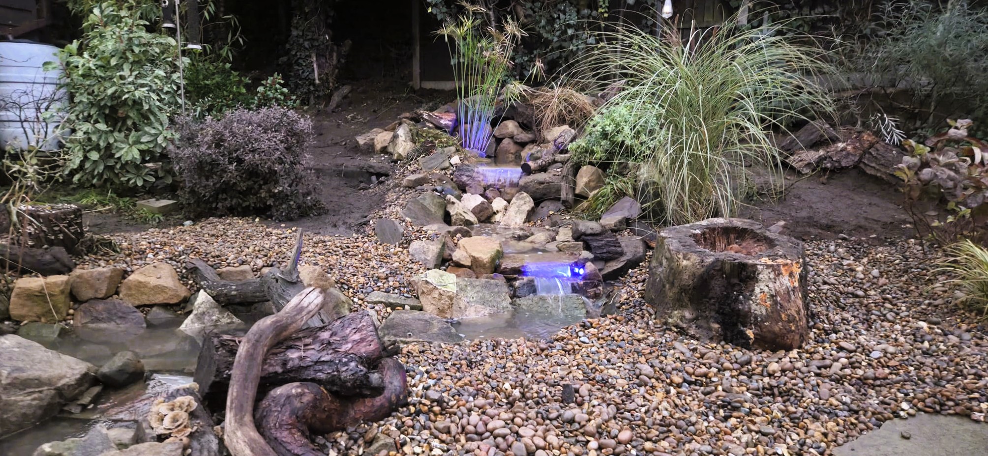 We replaced the original waterfall with a new multi-drop design, each drop adding movement, sound, and oxygenation. Colour-changing lights were added at the customer’s request within the falls, giving the customer control over the atmosphere day or night.