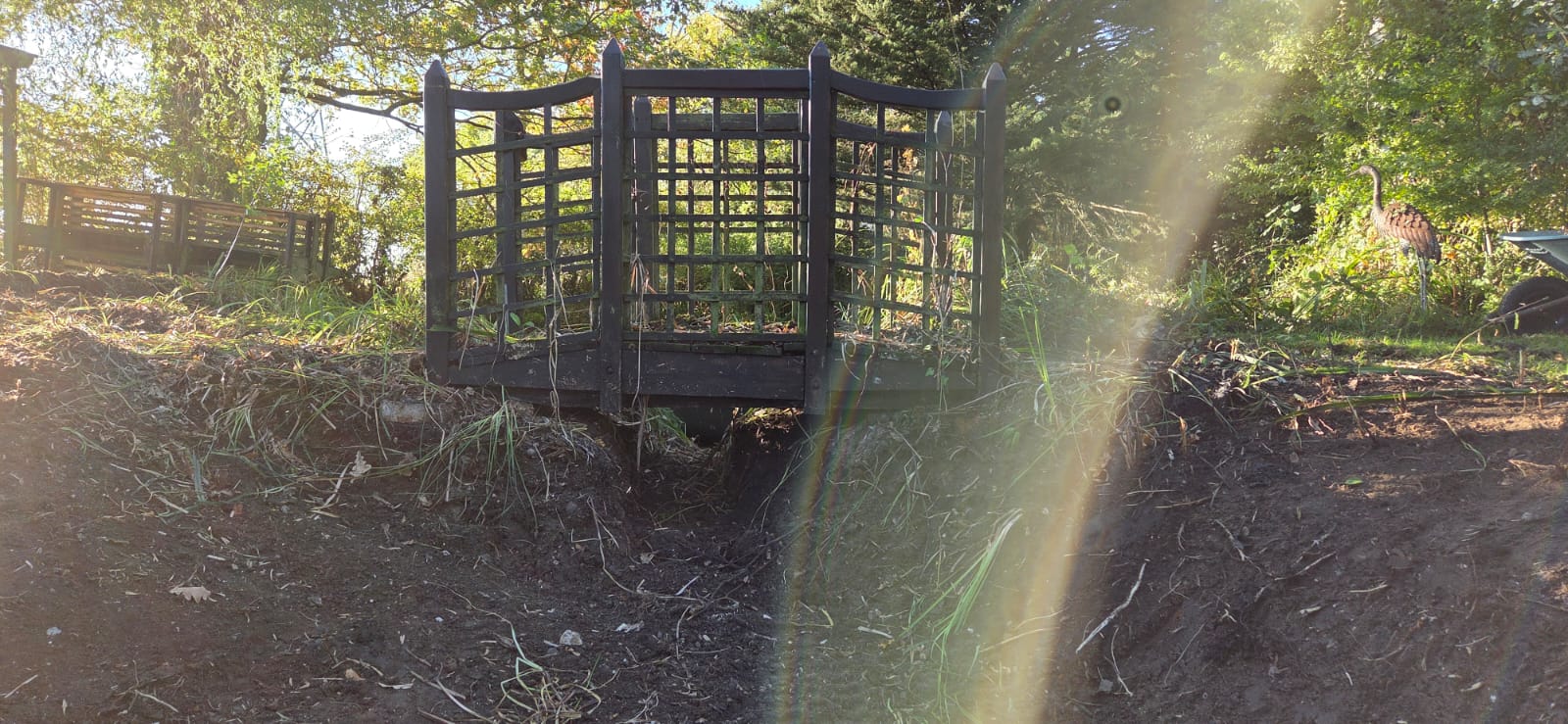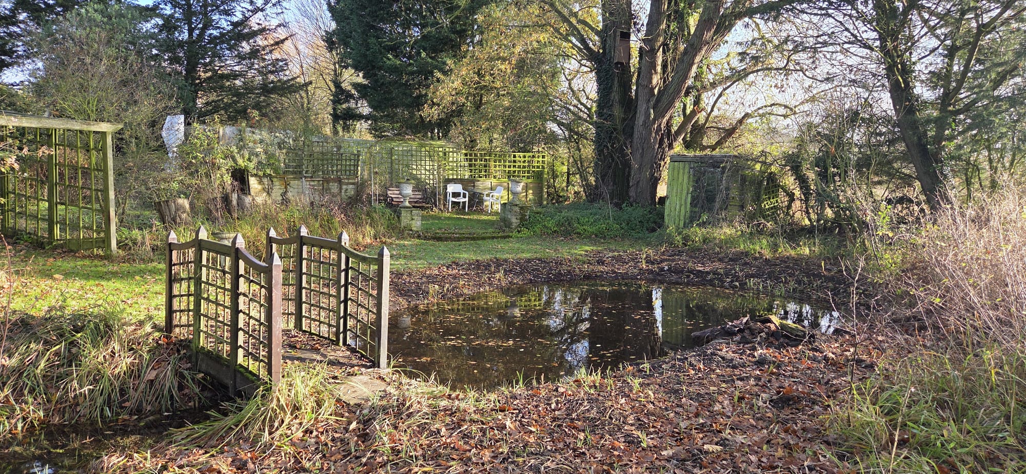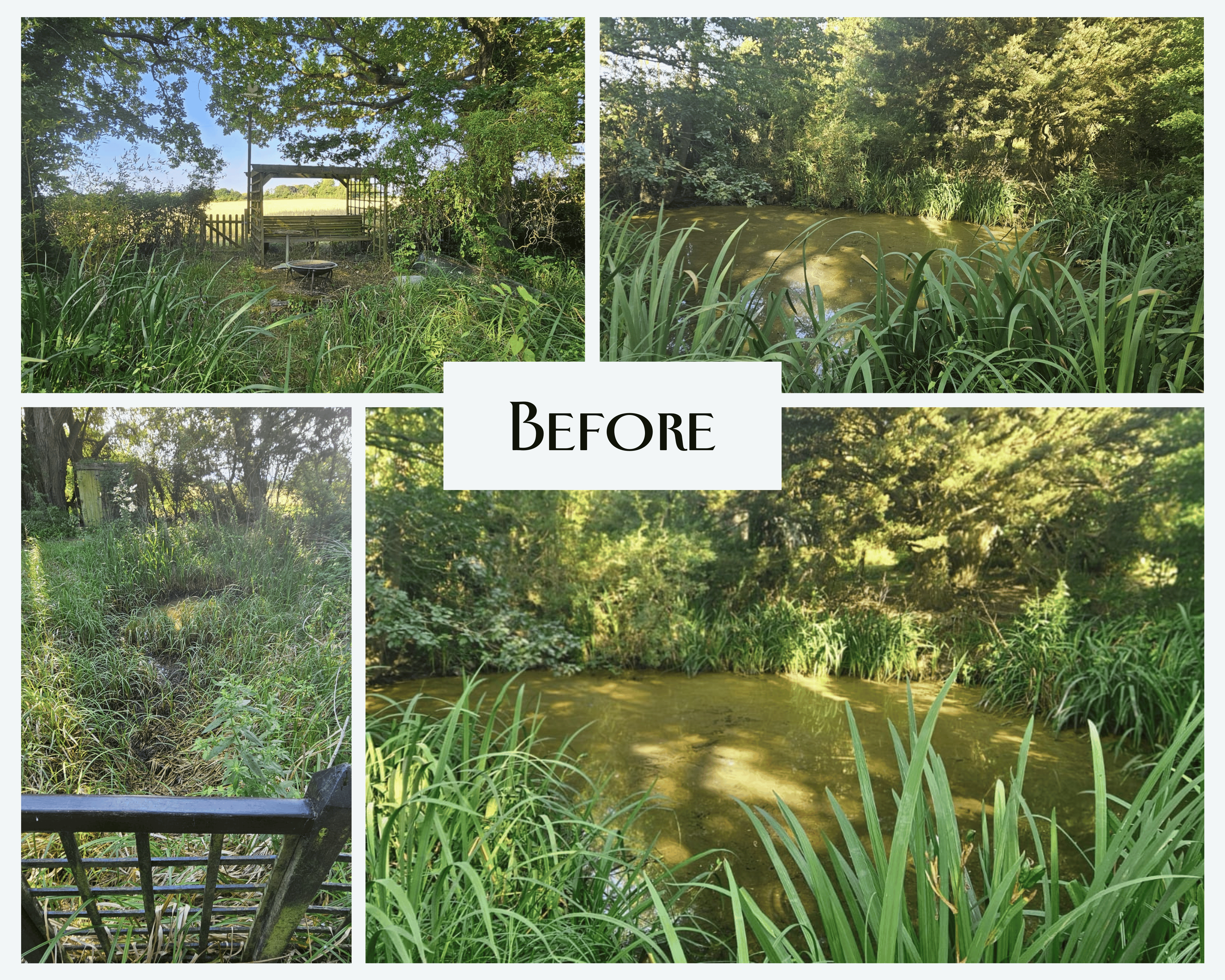 This project began with a former wildlife pond that had become completely overgrown and deeply silted, to the point where nothing could survive in it anymore. One side of the pond, which used to flow beneath a bridge, had silted up entirely, cutting the pond in two. The bridge had effectively become a viewing platform with no water flowing beneath it and no connection between the sections.