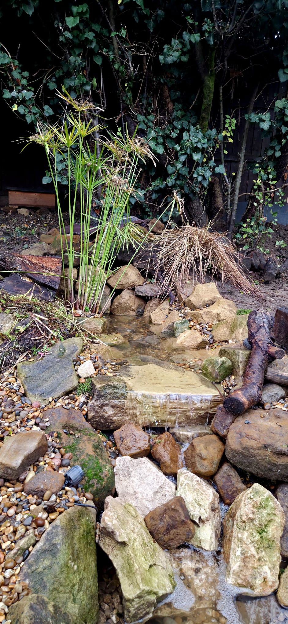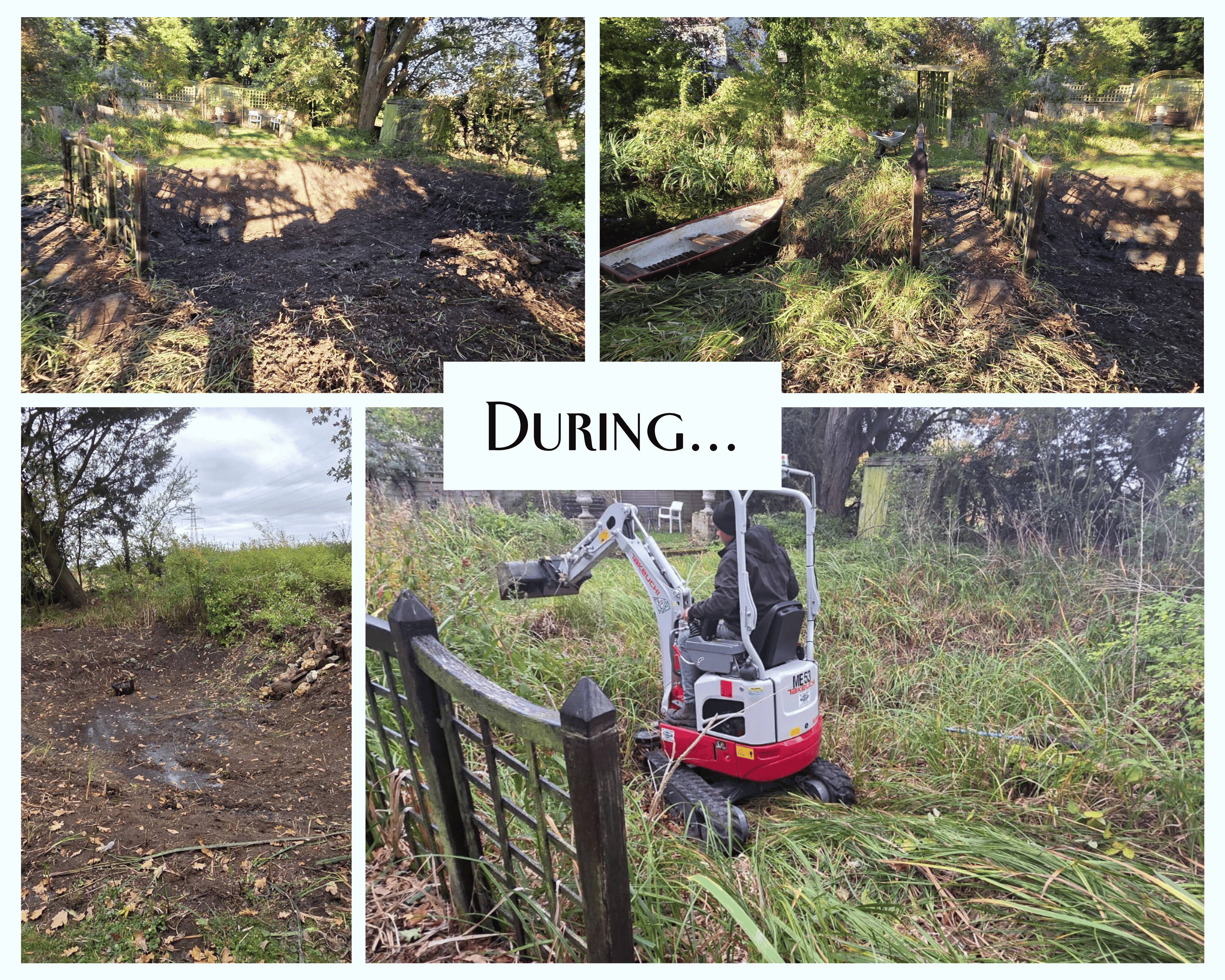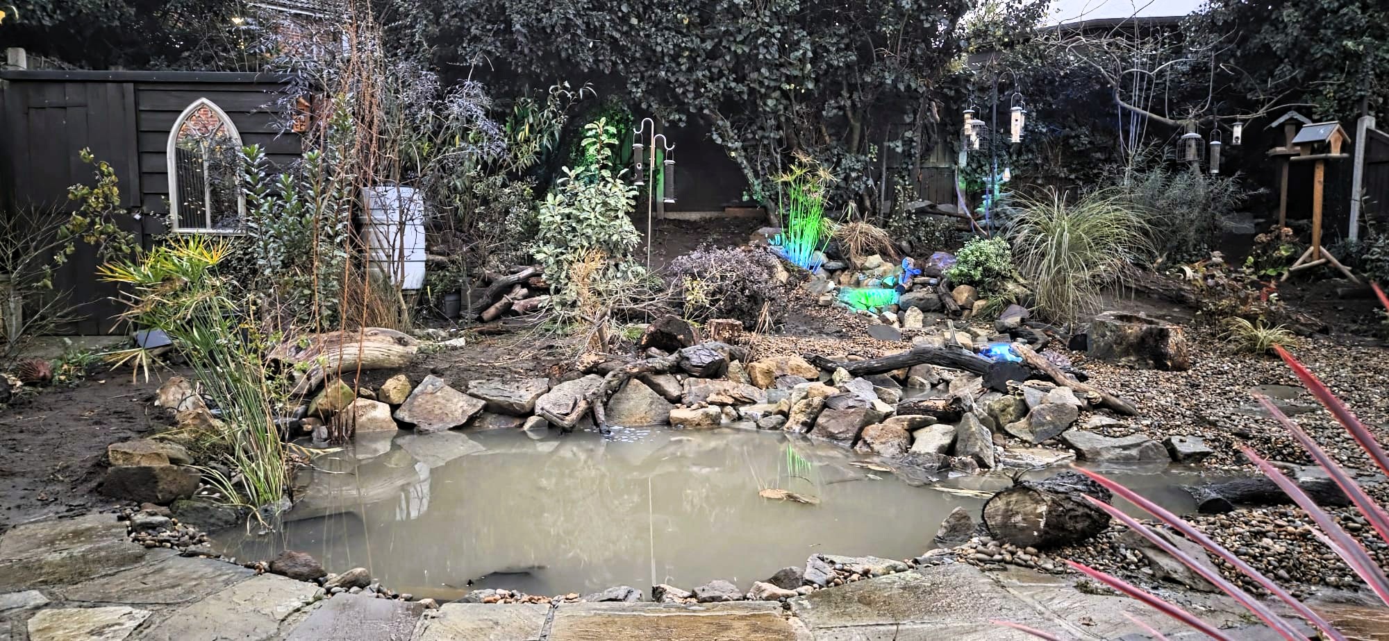 As seen in the progress photos, pond work can look muddy and disruptive, especially in autumn storms, but every stage leads toward the final vision. Although the water was still cloudy on the handover day, we’ll return once it settles for a final clean and tidy, ready for spring.